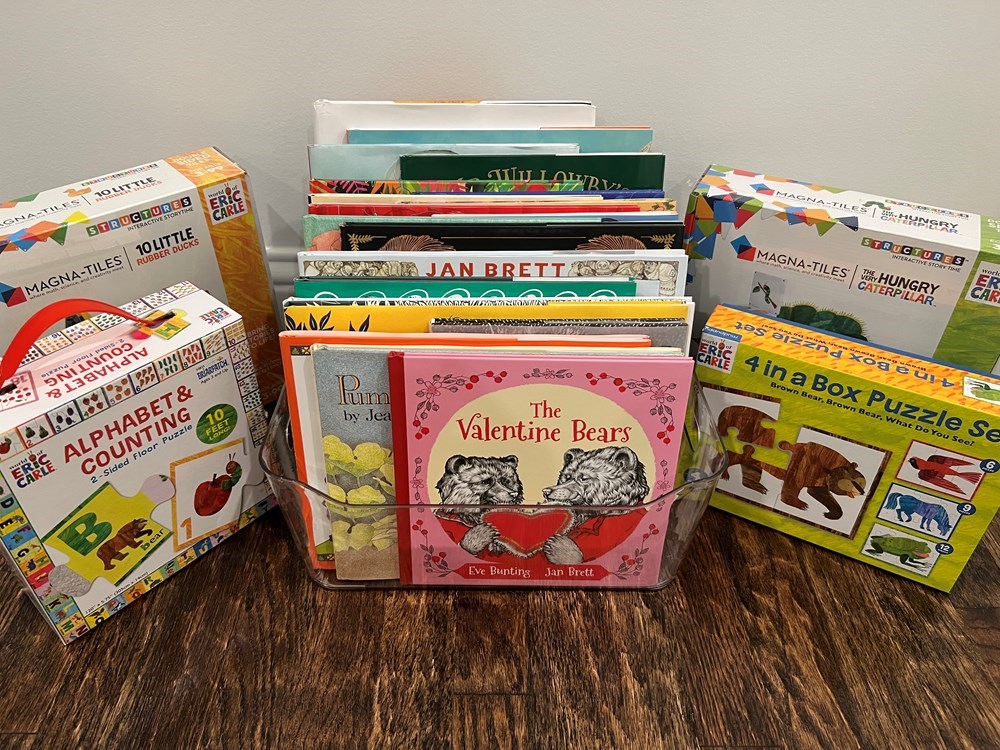 A Year of Books! Classic books for every season and holiday paired with educational games. Kay and the Big Snow Stopping by the Woods on a Snowy Evening Squanto and the Miracle of Thanksgiving Sharing the Bread Ten Red Apples Independence Cake The Best Christmas Pageant Ever The Story of Christmas Jabari Jumps Blueberries for Sal The Three Snow Bears The Garden The Curtains The Cross Bunny’s First Spring Somebody Loves You, Mr. Hatch The Valentines Bears Mr. Willowby’s Christmas Tree Thank you, Sarah Cranberry Halloween Pumpkin Pumpkin The Kissing Hand Magna Tiles – The Very Hungry Caterpillar + Book Magna Tiles – 10 Little Rubber Ducks + Book 4 in a Box Puzzle Set Alphabet & Counting Floor Puzzle VALUE $380