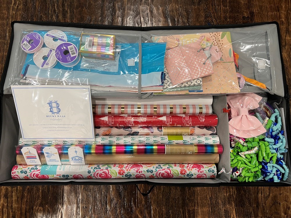 Container Store Grey Wrap & Tote Organizer $75 Gift Card to Swoozie’s $25 Gift Card to Sample House Becky Haas custom watercolor monogram tags and 3 packs of tags Loaded with: 8 rolls of wrapping paper 8 gift bags 3 packages of tissue paper Tons of ribbon, tape, bows and more! VALUE: $300