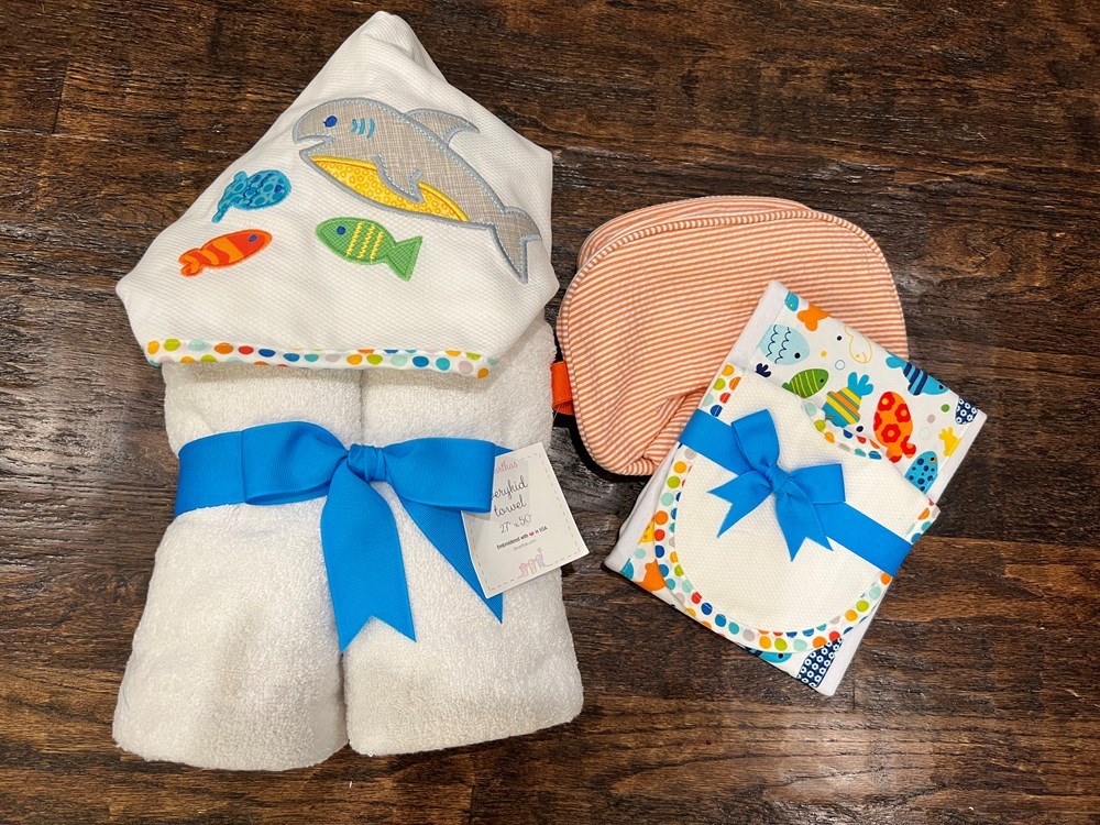 The perfect baby bundle gift set! Fish hooded towel Fish bib + burp cloth set Orange mint dop kit VALUE $90