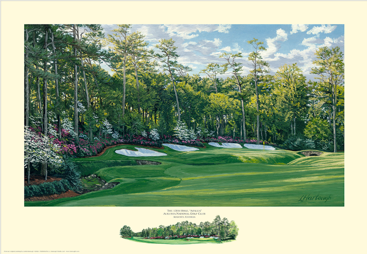 The 13th Hole, "Azalea", at Augusta National Golf Club. The first golf scene painted that launched the career of world-renowned golf artist Linda Hartough. A majestic par five that is probably the most famous hole on the golf course, was designed by Alistair MacKenzie at almost the moment he first laid eyes on the property. At the lowest point of the property, it parallels the path of Rae's Creek, winding around a right-to-left corner to where the creek crosses in front of the large green. Fine Art Paper - 22 3/4" x 26". Limited edition signed by the artist. From the estate of Judy Bell, benefitting the Colorado Golf Hall of Fame Museum.