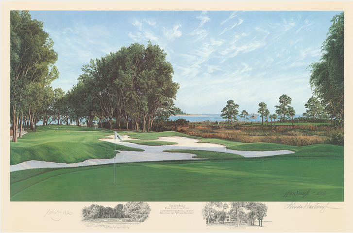 The 15th Hole at Haig Point Golf Club by world-renowned golf artist Linda Hartough. The Haig Point Golf Course opened in October, 1986 and received immediate acclaim. The natural setting of Daufuskie Island with its sandy soil, mature vegetation, saltwater marshes and spectacular vistas of Calibogue Sound and the Atlantic Ocean provided the ideal canvas for renowned golf course architect Rees Jones to create twenty-nine distinctly beautiful golf holes. Limited edition signed by artist and Rees Jones. Fine Art Paper - 20" x 30". From the estate of Judy Bell, benefitting the Colorado Golf Hall of Fame Museum.