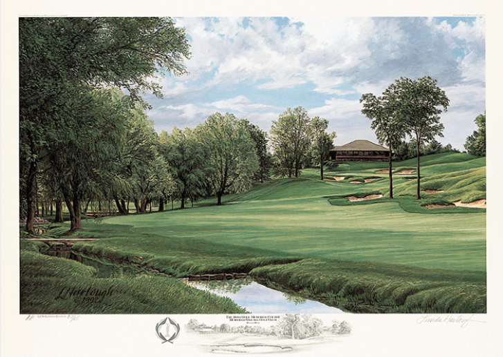 The 18th Hole, Memorial Course and Muifield Village Golf Club, by world-renowned golf artist Linda Hartough. Selected by a national panel as one of America's ten greatest courses since its first year of eligibility, and voted a favorite venue time and again by the PGA Tour players, Muirfield village opened in 1974, with the initial staging of the Memorial Tournament coming two years later. Created by Jack Nicklaus, all of Muirfield's holes are demanding, but none more so than the magnificient 18th. Fine Art Paper - 21 1/2" x 30". Limited edition signed by artist. From the estate of Judy Bell, benefitting the Colorado Golf Hall of Fame Museum.